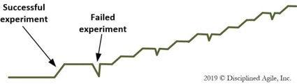 La Figura 3 muestra cómo la efectividad de tu equipo mejora en el tiempo con un enfoque de mejora continua. Cuando experimentas con una nueva técnica y funciona bien para tu equipo, la efectividad del equipo mejora. Cuando un experimento “falla”, la efectividad de tu equipo cae un poco. La técnica no funcionó bien en tu situación, pero terminas el experimento y vuelves a tu manera de trabajar previa (el nivel de efectividad de tu equipo vuelve a donde estaba).